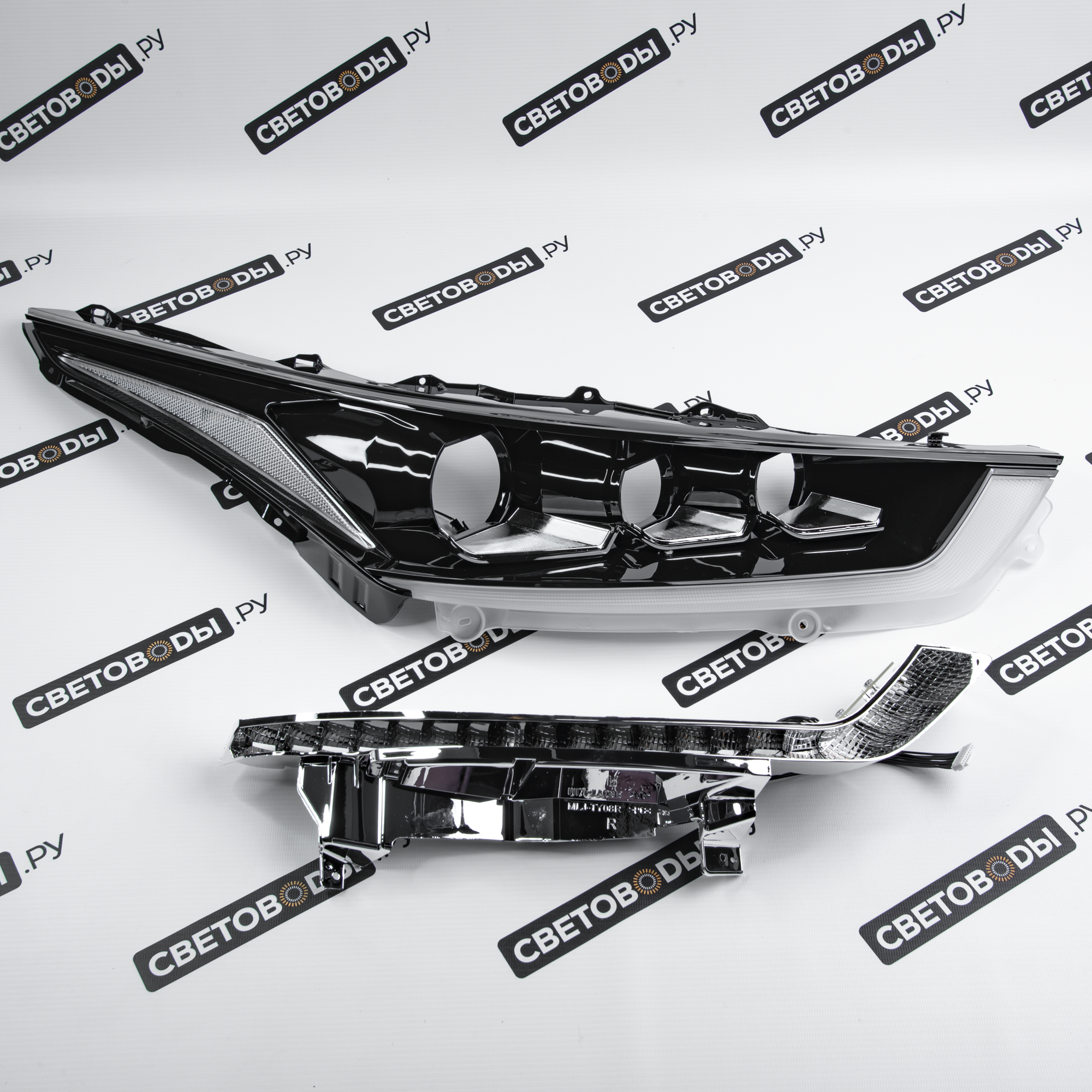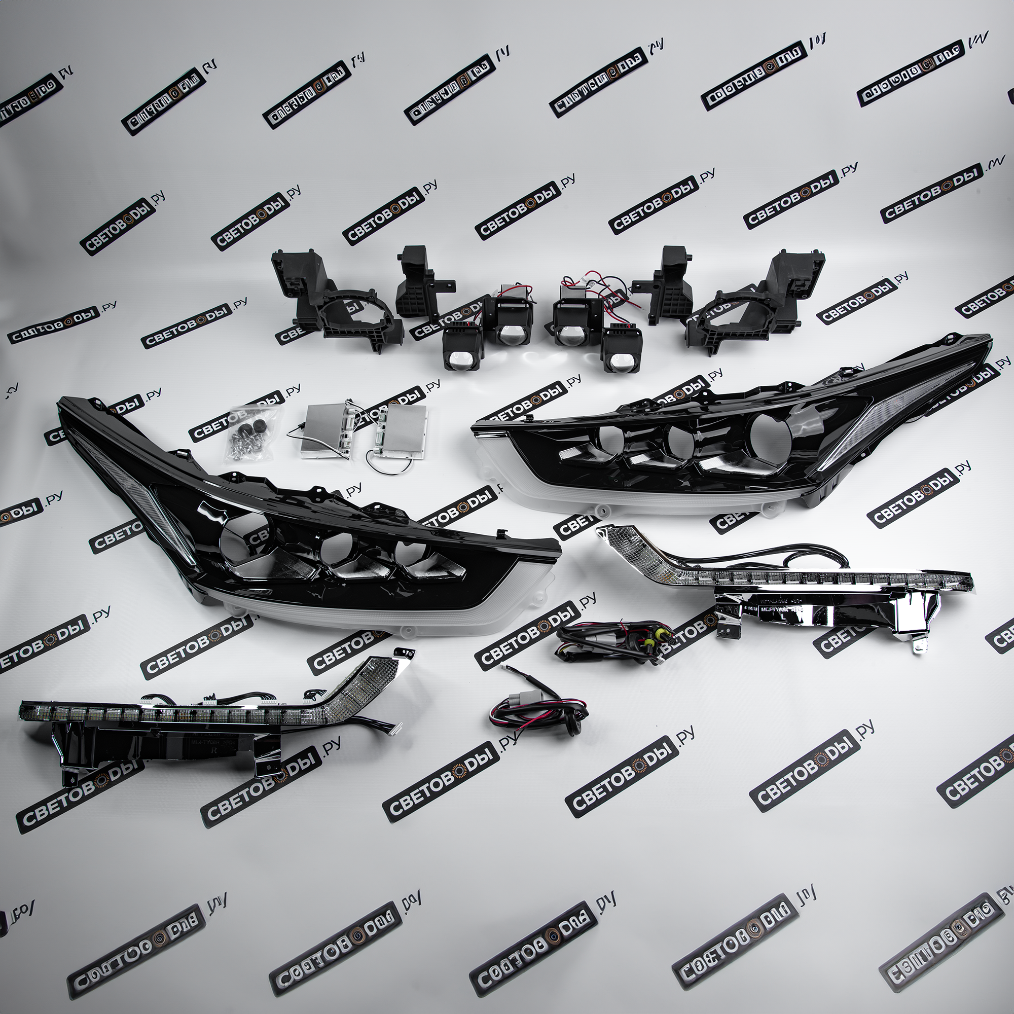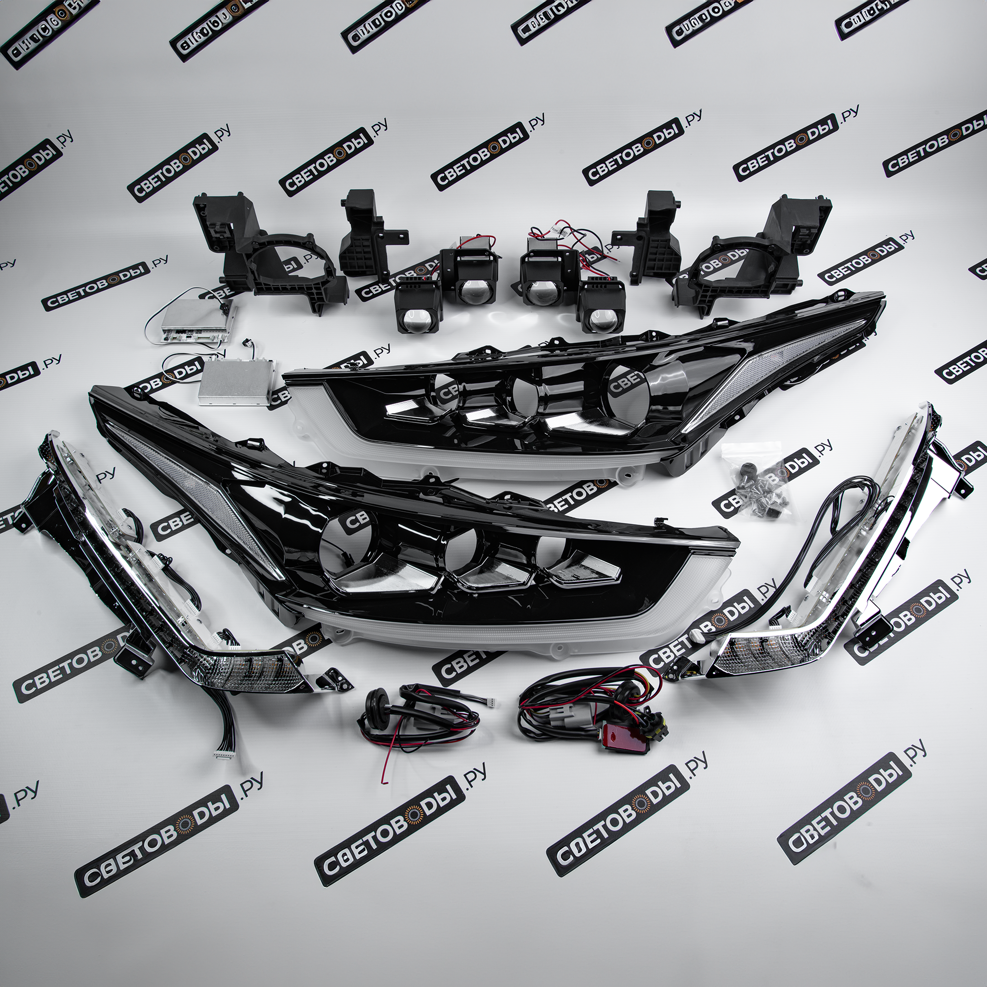 Комплект для установки линз включает все необходимые компоненты: крепежи, переходные рамки и, в некоторых случаях, блоки розжига, линзы, проводку. Такой комплект не только упрощает процесс модернизации фар, но и позволяет улучшить комплектацию и придать автомобилю Toyota Highlander 6 U70 2019-2025 более стильный и современный вид.