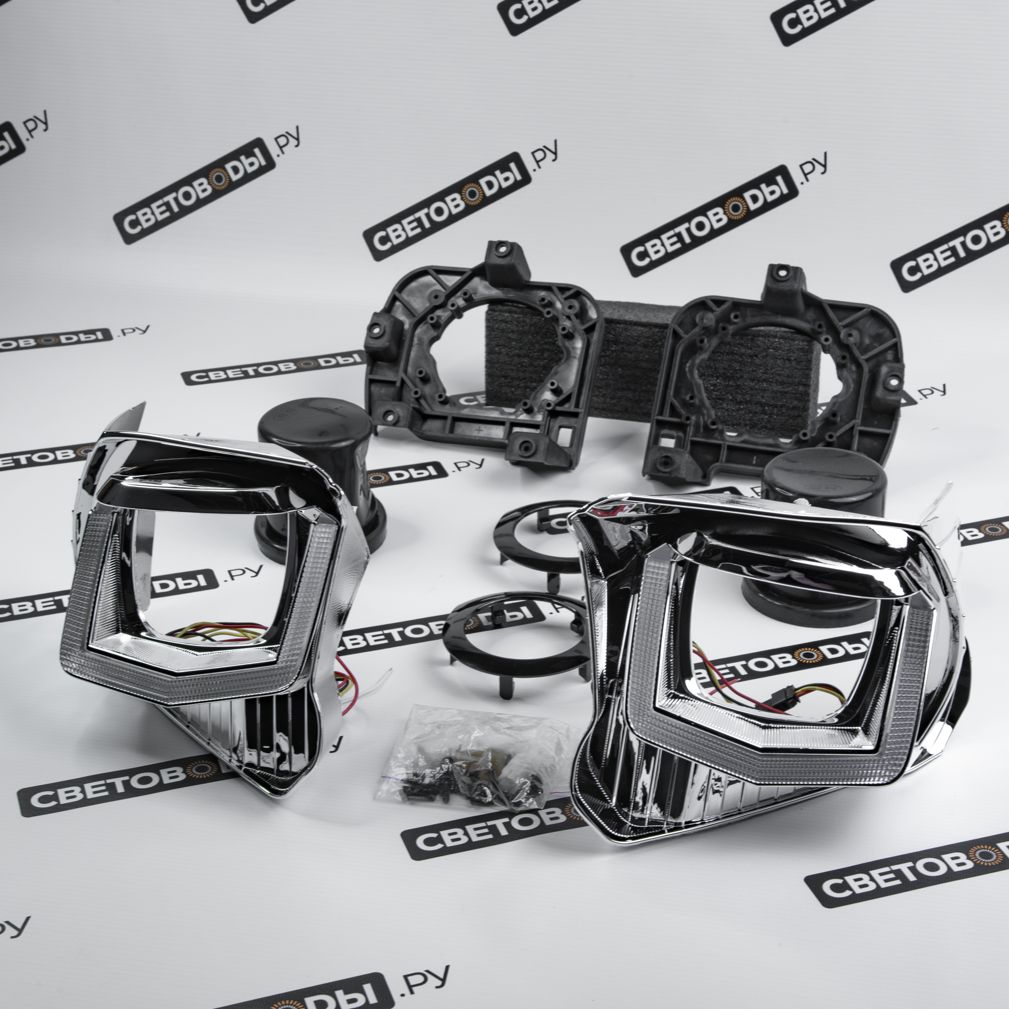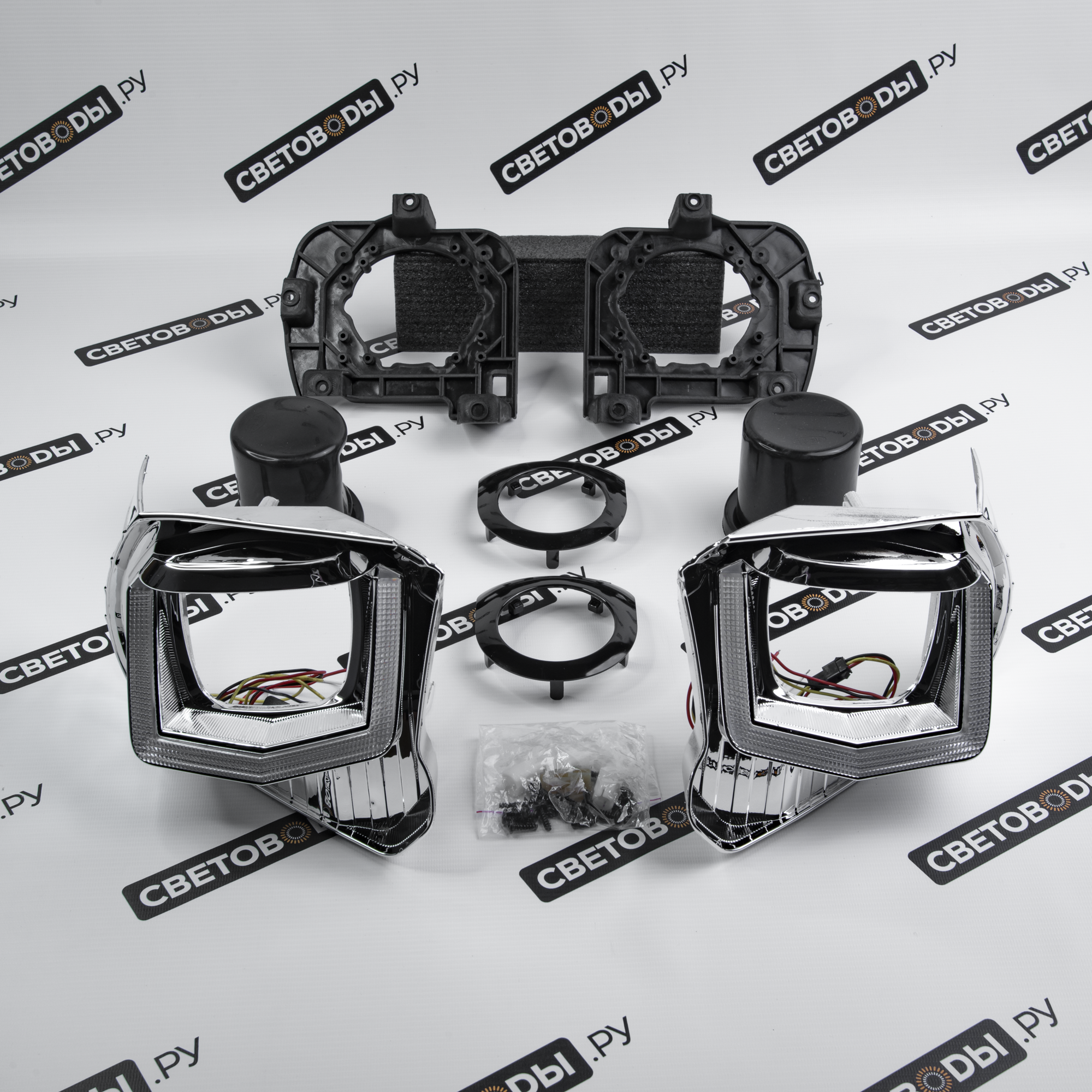 Комплект для установки линз включает все необходимые компоненты: крепежи, переходные рамки и, в некоторых случаях, блоки розжига, линзы, проводку. Такой комплект не только упрощает процесс модернизации фар, но и позволяет улучшить комплектацию и придать автомобилю Toyota Tundra 2 РЕСТ 2013-2021 более стильный и современный вид.